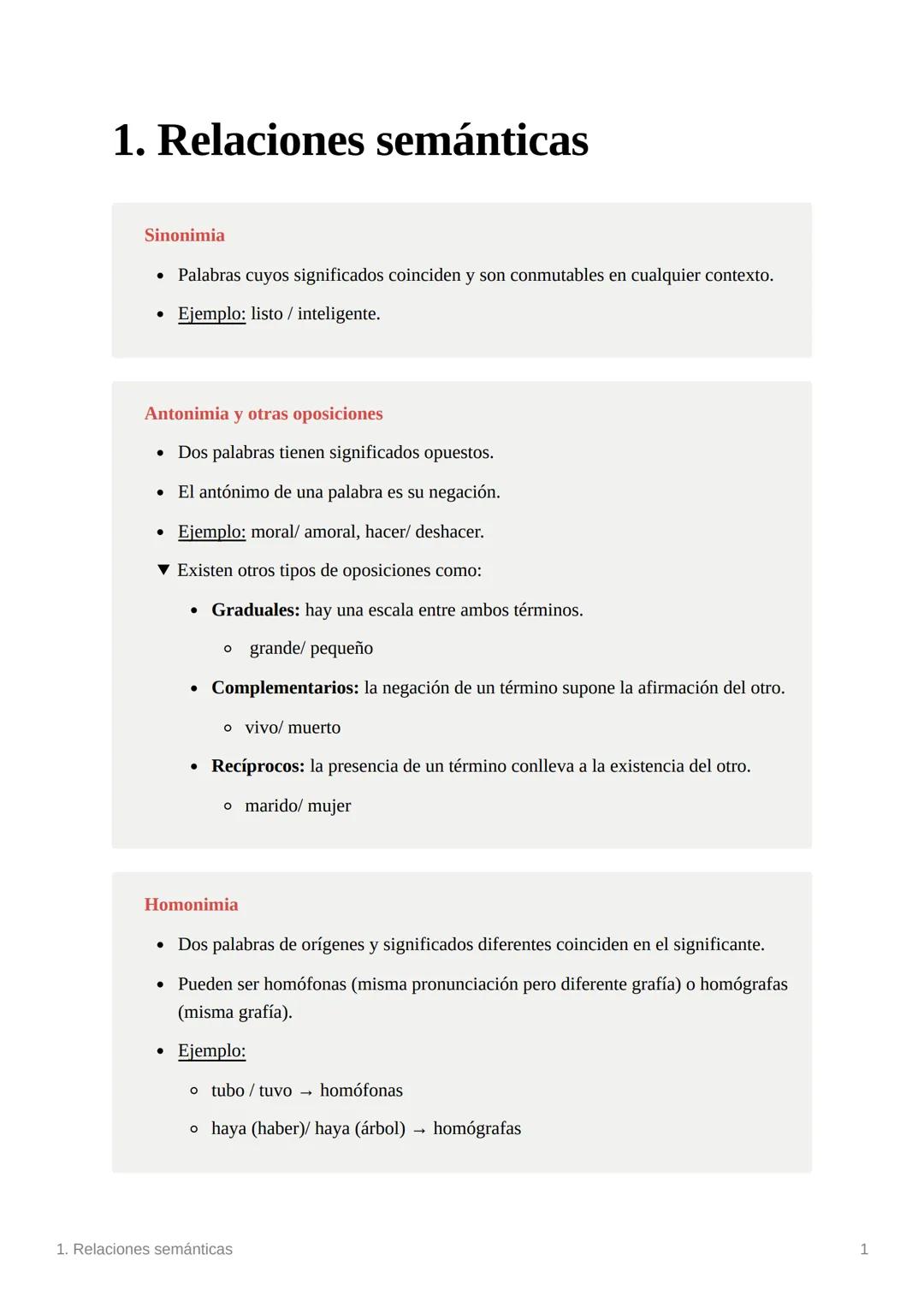 Sinonimia, antonimia, oposiciones, homonimia, hiperonimia, hiponimia, paronimia, monosemia y polisemia.