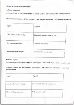 El futuro simple en inglés utiliza "will" como auxiliar principal. La forma afirmativa se construye sujeto + will + verbo base. Por ejemplo "I will walk to work every day" (Iré andando al trabajo todos los días). La forma negativa utiliza "won't" (contracción de will not) "She won't like your present" (No le gustará tu regalo).