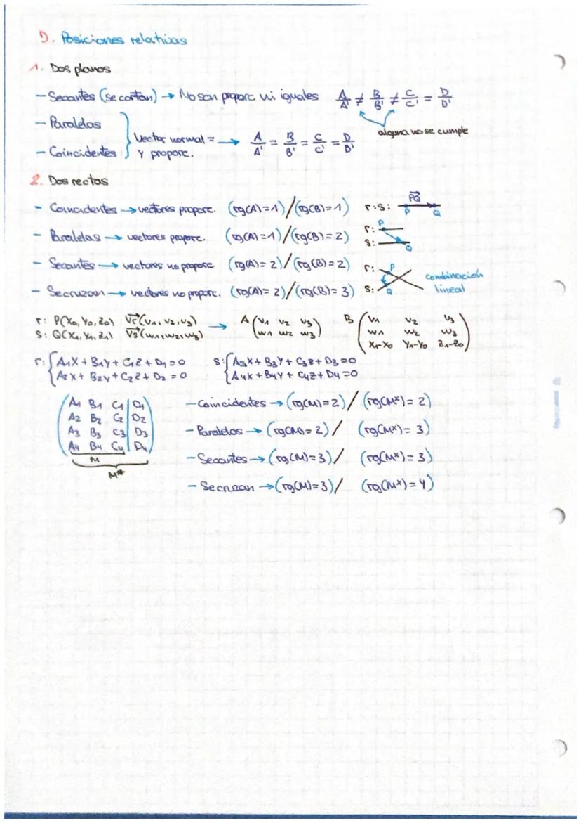 Rectas, ecuaciones de la recta, planos, ecuaciones de los planos, posiciones relativas de: dos rectas, recta y plano, dos planos y tres planos.