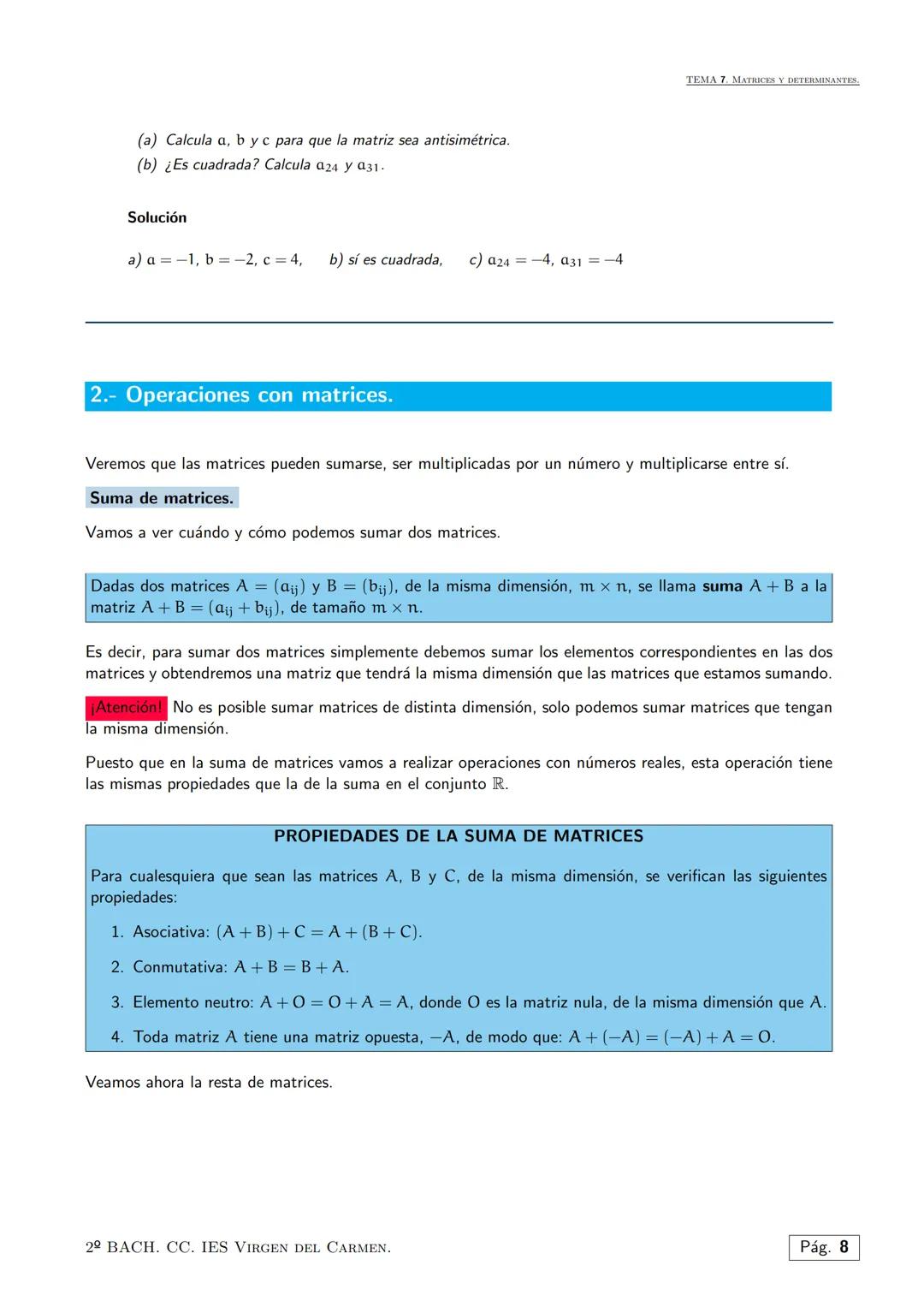 Esta sección aborda las principales operaciones que se pueden realizar con matrices, sentando las bases para el álgebra matricial.
