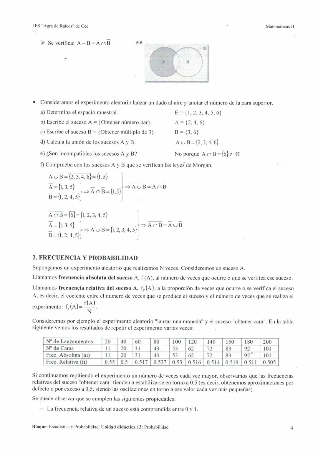 Las operaciones con sucesos nos permiten combinar diferentes resultados posibles. La unión de sucesos (A∪B) ocurre cuando se realiza al menos uno de ellos, mientras que la intersección (A∩B) requiere que ambos sucedan simultáneamente. Dos sucesos son incompatibles cuando no pueden ocurrir a la vez.